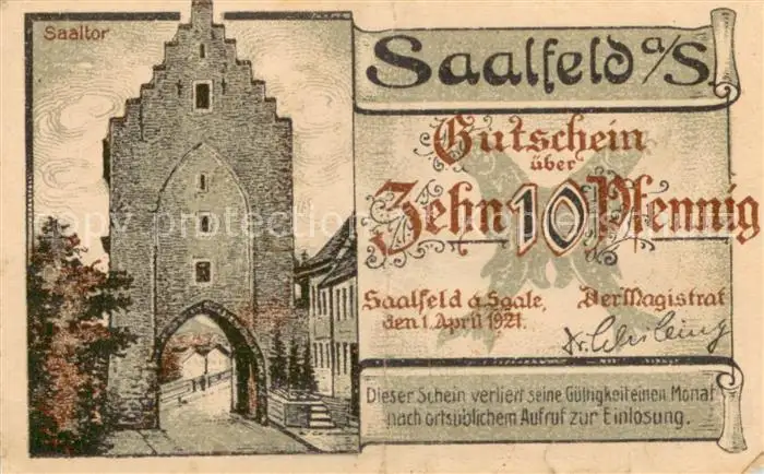 Saalfeld_Saale Saaltor Saalebruecke Zehn Pfennig Gutschein Saalfeld_Saale postalisch nicht gelaufen 1921 Notgeldschein (keine Postkarte) Erhaltung siehe scans [WerneD78] Notgeldschein (keine Postkarte) WernPID7