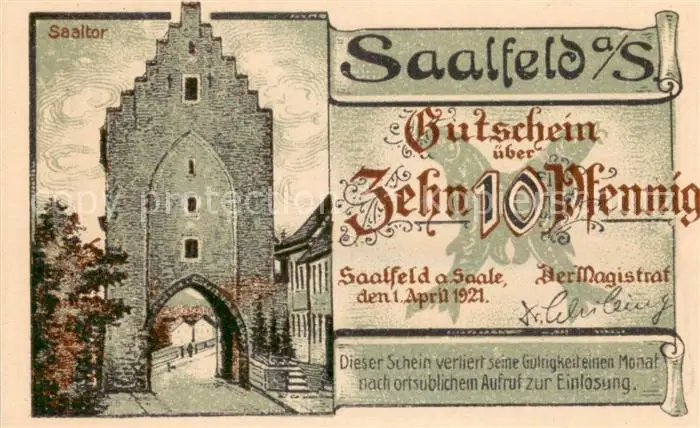 Saalfeld_Saale Saaltor Saalebruecke Zehn Pfennig Gutschein Saalfeld_Saale postalisch nicht gelaufen 1921 Notgeldschein (keine Postkarte) Erhaltung siehe scans [WerneD78] Notgeldschein (keine Postkarte) WernPID7