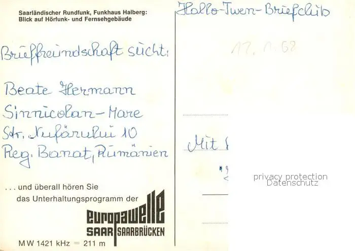 Saarbruecken Saarlaendischer Rundfunk Funkhaus Halberg Saarbruecken postalisch nicht gelaufen 1968 Erhaltung siehe scans [FriedD77] Frierer