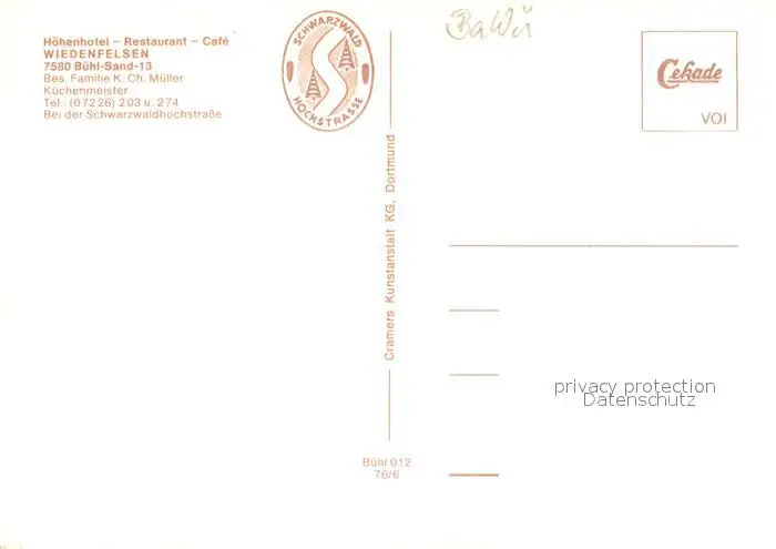 Sand_Buehl Hotel Restaurant Wiedenfelsen Mummelsee Schwarzenbachtalsperre Schwarzwaldhochstrasse Sand_Buehl postalisch nicht gelaufen 1976 Erhaltung siehe scans [FriedD77] Frierer