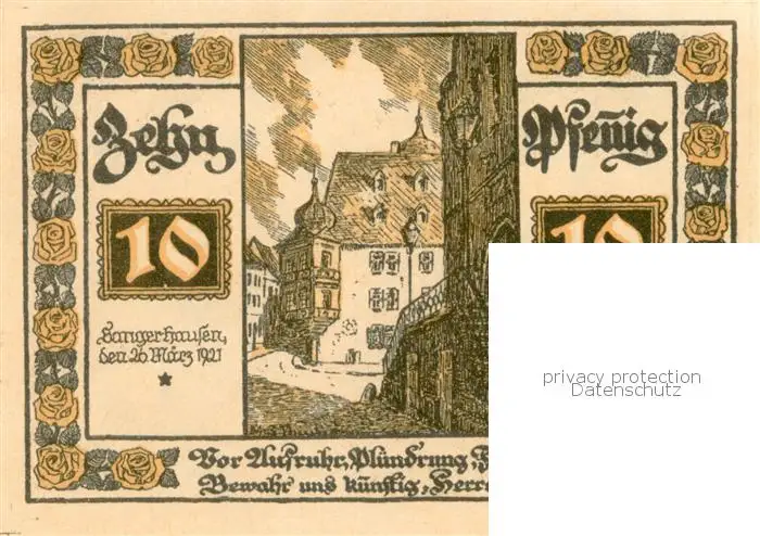 Sangerhausen_Suedharz 10 Pfennig Notgeld Sangerhausen Suedharz postalisch nicht gelaufen 1921 Notgeldschein (keine Postkarte) Erhaltung siehe scans [FriedD77] Notgeldschein (keine Postkarte) Frierer