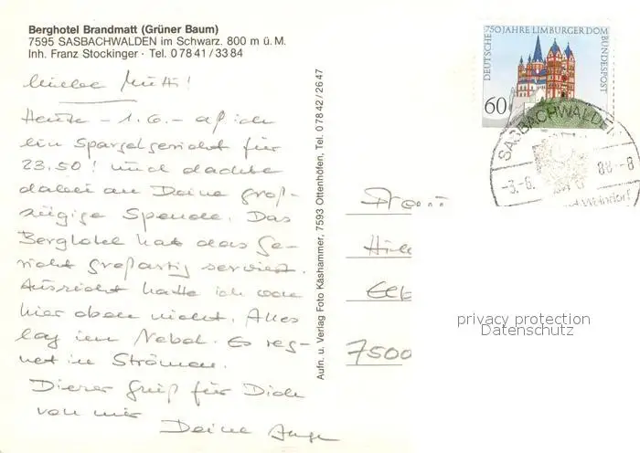 Sasbachwalden Kategorie Alte Ansichtskarten Postkarten bx46005 Sasbachwalden Berghotel Brandmatt Sasbachwalden postalisch gelaufen 1988 Erhaltung siehe scans [LiesaD40]