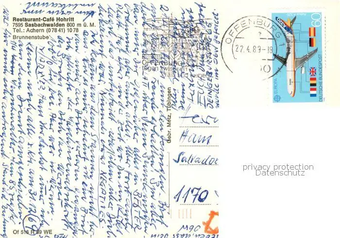 Sasbachwalden Restaurant Cafe Hohritt Brunnenstube Sasbachwalden postalisch gelaufen 1989 Erhaltung siehe scans [WerneD78] WernPID7