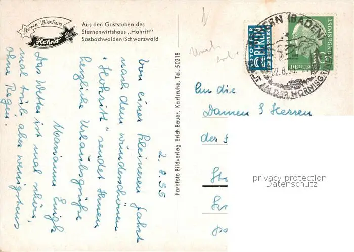 Sasbachwalden Wirtshaus Hohritt Sasbachwalden postalisch gelaufen 1955 Erhaltung siehe scans [PaolaD17] PaolPID1