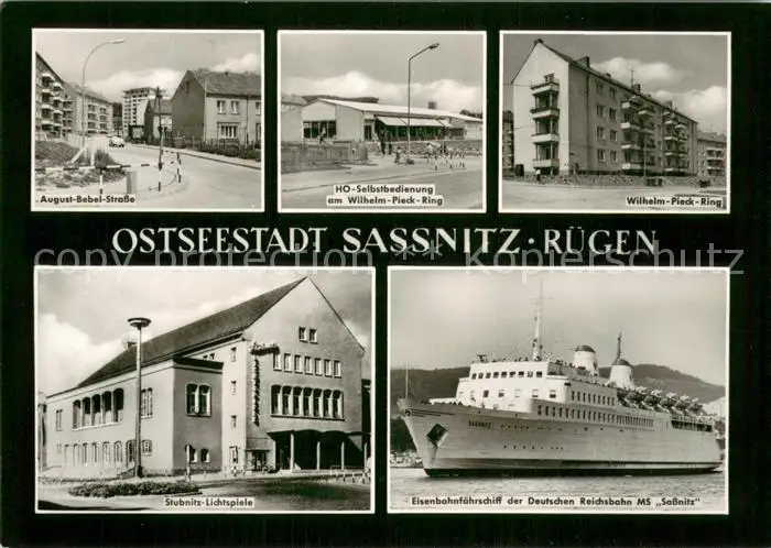 Sassnitz_Ostseebad_Ruegen August Bebe Strasse HO Selbstbedienung Wilhelm Piek Ring Stubnitz Lichtspiele Eisenbahnfaehrschiff der Dt Reichsbahn MS Sassnitz Sassnitz_Ostseebad_Ruegen postalisch gelaufen 1966 Erhaltung siehe scans [WerneD78] WernPID7