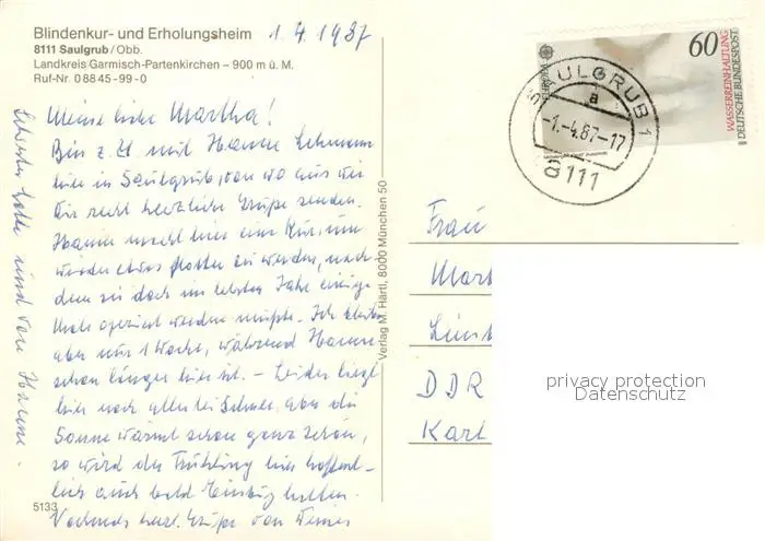Saulgrub Blindenkur- und Erholungsheim Blumenwiese Saulgrub postalisch gelaufen 1987 Erhaltung siehe scans [FriedD77] Frierer