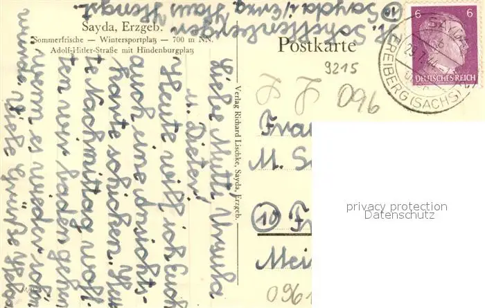 Sayda Strasse mit Hindenburgplatz Kirchturm Sayda postalisch gelaufen 1944 Erhaltung siehe scans [FriedD77] Frierer
