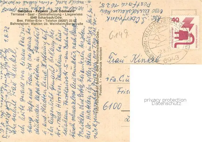 Scharbach Gasthaus Pension Zum Odenwald Gastraeume Panorama Scharbach postalisch gelaufen 1972 Erhaltung siehe scans [FriedD77] Frierer