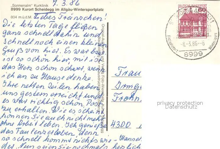 Scheidegg_Allgaeu Kurklinik Sonnenalm Schwimmbad Scheidegg Allgaeu postalisch gelaufen 1986 Erhaltung siehe scans [LiesaD40] LiesID40