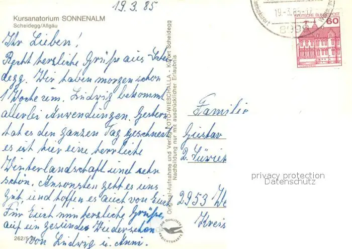 Scheidegg_Allgaeu Kursanatorium Sonnenalm Winterimpressionen Allgaeuer Alpen Scheidegg Allgaeu postalisch gelaufen 1985 Erhaltung siehe scans [FriedD77] Frierer