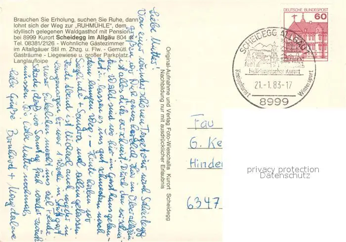 Scheidegg_Allgaeu Panorama Waldgasthof Ruhmuehle Gaststube Kaminzimmer Scheidegg Allgaeu postalisch gelaufen 1983 Erhaltung siehe scans [WerneD78] WernPID7