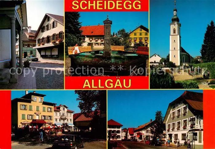 AK / Ansichtskarte Scheidegg_Allgaeu Teilansichten Brunnen Kirche Scheidegg Allgaeu