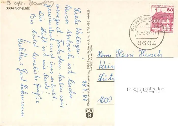 Schesslitz Panorama Brunnen Kirche Rathaus Gasthof Schwimmbad Schesslitz postalisch gelaufen 1987 Erhaltung siehe scans [WerneD78] WernPID7