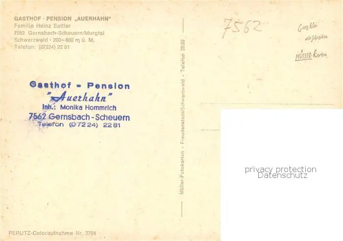 Scheuern_Gernsbach Gasthof Pension Auerhahn Gaststube Scheuern Gernsbach postalisch nicht gelaufen nach 1965 Erhaltung siehe scans [FriedD77] Frierer