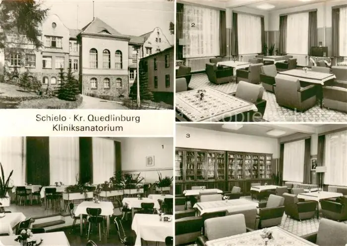 AK / Ansichtskarte Schielo_Harz Kliniksanatorium Innen und Aussen m. Speisesaal u. Klubraum Schielo Harz