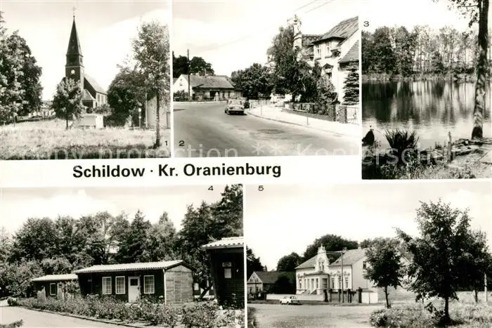 AK / Ansichtskarte Schildow Kirche Katharinensee Bungalows Jugendherberge Paul Richter Dorfplatz Schildow