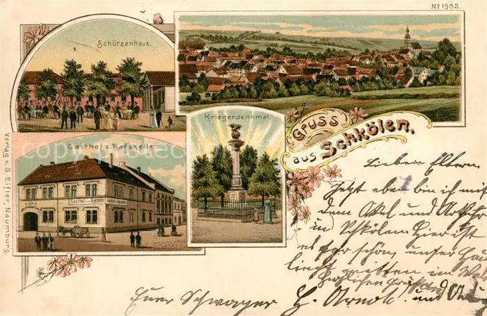 Schkoelen Kategorie Alte Ansichtskarten Postkarten bx56456 Schkoelen Kriegerdenkmal Gasthof Ratskeller Schuetzenhaus Schkoelen postalisch gelaufen 1902 Erhaltung siehe scans [NatalD47]