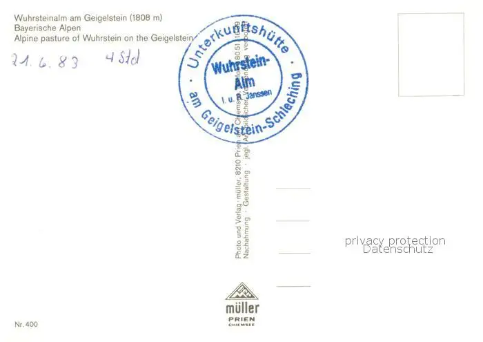 Schleching Wuhrsteinalm am Geigelstein Hochgern Watzmanngebiet Achental Schleching postalisch nicht gelaufen 1983 Erhaltung siehe scans [FriedD77] Frierer