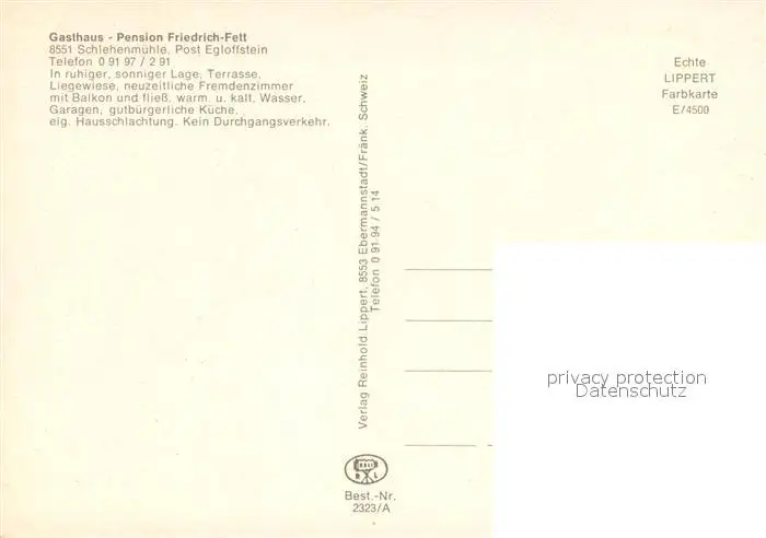 Schlehenmuehle_Egloffstein Kategorie Alte Ansichtskarten Postkarten kr23927 Schlehenmuehle_Egloffstein Gasthof Pension Friedrich Fett Restaurant Terrasse postalisch nicht gelaufen nach 1965 Erhaltung siehe scans [FriedD77]
