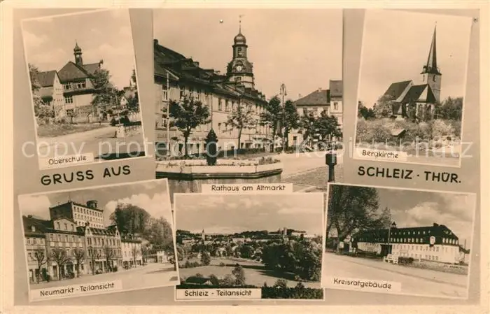 Schleiz Oberschule Rathaus Altmarkt Bergkirche Neumarkt Kreisratgebaeude Schleiz postalisch gelaufen 1921-1965 Erhaltung siehe scans [FriedD77] Frierer