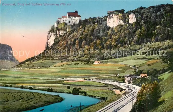 Schloss_Werenwag_Beuron Donautal m. Schloss-Ansicht u. Zug-Linie postalisch gelaufen 1913 Erhaltung siehe scans [LiesaD40] LiesID40