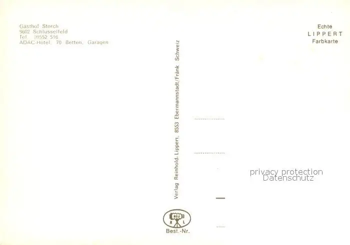 Schluesselfeld Gasthof Storch Zentrum Torbogen Turm Ortsansicht mit Kirche Wappen Schluesselfeld postalisch nicht gelaufen nach 1965 Erhaltung siehe scans [FriedD77] Frierer