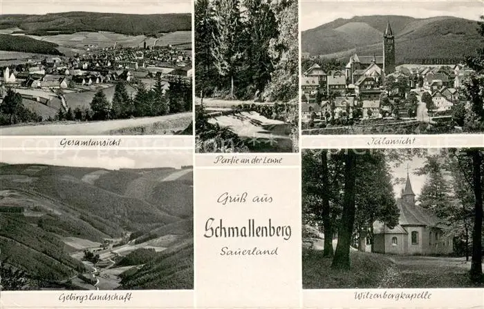 Schmallenberg Gesamtansicht Panorama Gebirgslandschaft Partie an der Lenne Ortsansicht mit Kirche Wilzenbergkapelle Schmallenberg postalisch nicht gelaufen 1921-1965 Erhaltung siehe scans [FriedD77] Frierer