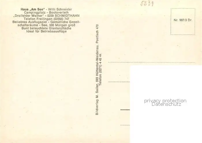 Schmidthahn Dreifelder Weiher Haus Am See Badestrand Schwaene Schmidthahn postalisch nicht gelaufen nach 1965 Erhaltung siehe scans [LiesaD40] LiesID40