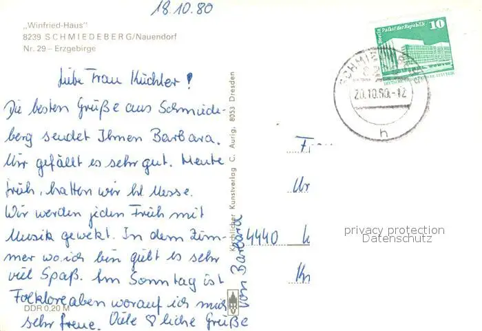 Schmiedeberg _Dippoldiswalde Winfried Haus im Erzgebirge Schmiedeberg postalisch gelaufen 1980 Erhaltung siehe scans [FriedD77] Frierer