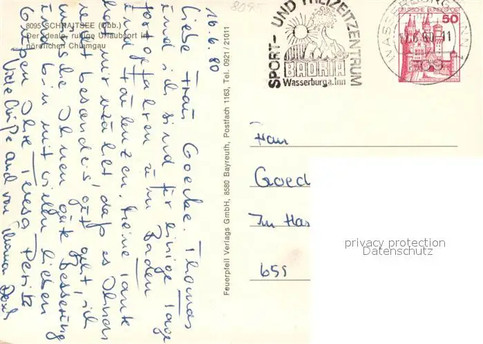Schnaitsee Panorama Sendemast Badesee Kirche Schnaitsee postalisch gelaufen 1980 Erhaltung siehe scans [WerneD78] WernPID7