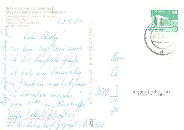 Schnarrtanne Ferienheim des VEB Nema Netzschkau OT Vogelsgruen Kinderkurheim Rat der Gemeinde Schnarrtanne postalisch gelaufen 1984 Erhaltung siehe scans [FriedD77] Frierer