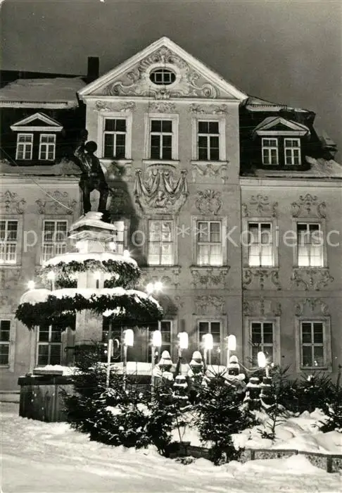 Schneeberg Erzgebirge Kategorie Alte Ansichtskarten Postkarten kq47491 Schneeberg_Erzgebirge Bergmannsbrunnen zur Weihnachtszeit Nachtaufnahme Schneeberg Erzgebirge postalisch nicht gelaufen 1983 Erhaltung siehe scans [FriedD77]