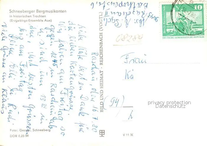 Schneeberg_Erzgebirge Schneeberger Bergmusikanten in historischen Trachten Schneeberg Erzgebirge postalisch gelaufen 1980 Erhaltung siehe scans [FriedD77] Frierer