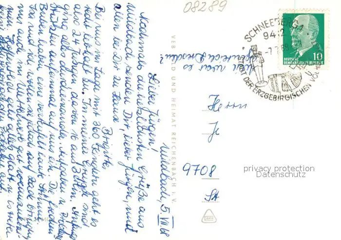 Schneeberg_Erzgebirge Teilansicht mit Kirche Haus der Einheit Filzteich Schneeberg Erzgebirge postalisch gelaufen 1968 Erhaltung siehe scans [FriedD77] Frierer