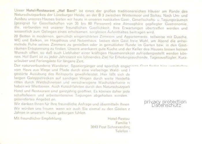 Schneverdingen Hotel Hof Barrl Restaurant Fachwerk Reiter Schneverdingen postalisch nicht gelaufen nach 1965 Werbekarte (keine Postkarte) Erhaltung siehe scans [WerneD78] Werbekarte (keine Postkarte) WernPID7