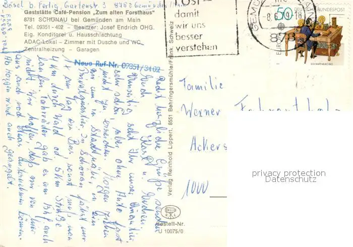 Schoenau_Gemuenden Gaststaette Café Pension Zum alten Forsthaus Schoenau Gemuenden postalisch gelaufen 1979 Erhaltung siehe scans [FriedD77] Frierer