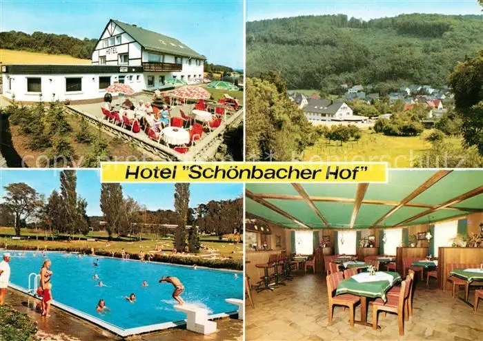 AK / Ansichtskarte Schoenbach_Dillkreis Hotel Schoenbacher Hof Schwimmbad Gastraum Terrasse Schoenbach Dillkreis