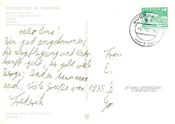 Schoeneck_Vogtland Blick vom Alten Soell Thaelmann Breitscheid Platz Rathaus Alter Soell Jugendherberge Hertha Lindner Schoeneck_Vogtland postalisch gelaufen 1988 Erhaltung siehe scans [WerneD78] WernPID7