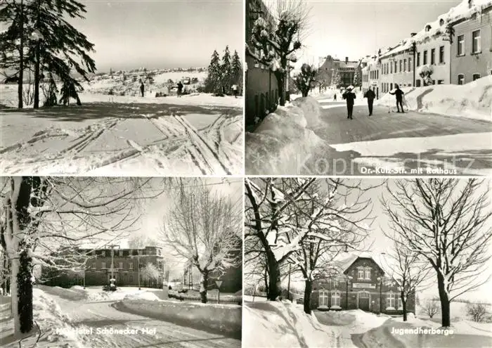 AK / Ansichtskarte Schoeneck_Vogtland panorama Dr Kuelz Str mit Rathaus Hotel Schoenecker Hof Jugendherberge Schoeneck_Vogtland