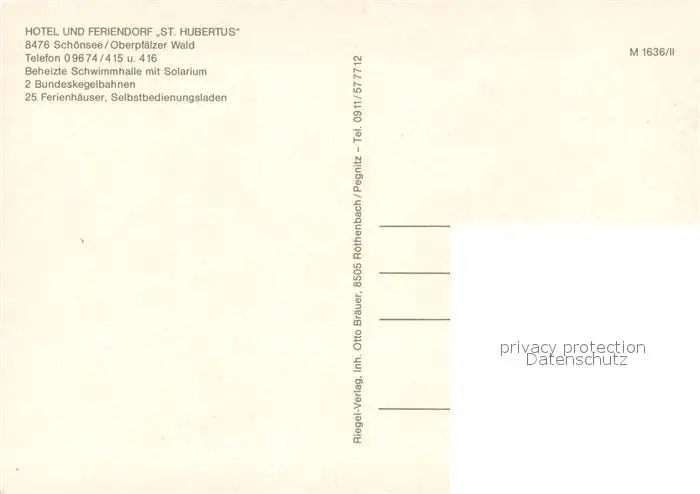 Schoensee Hotel Feriendorf St. Hubertus Bungalows Hallenbad Landschaftspanorama Oberpfaelzer Wald Schoensee postalisch nicht gelaufen nach 1965 Erhaltung siehe scans [FriedD77] Frierer