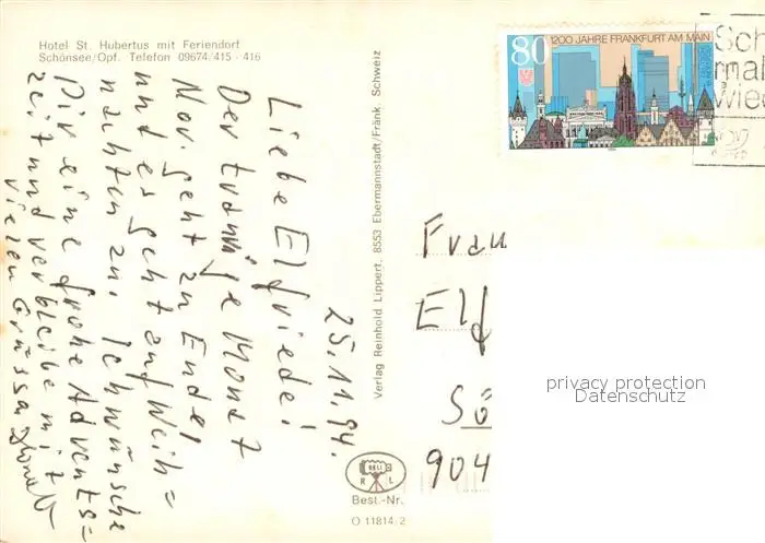 Schoensee Hotel St. Hubertus mit Feriendorf im Oberpfaelzer Wald Schoensee postalisch gelaufen 1994 Erhaltung siehe scans [FriedD77] Frierer