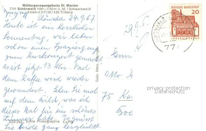 Schoenwald_Schwarzwald Muettergenesungsheim St Marien Schoenwald Schwarzwald postalisch gelaufen 1967 Erhaltung siehe scans [FriedD77] Frierer