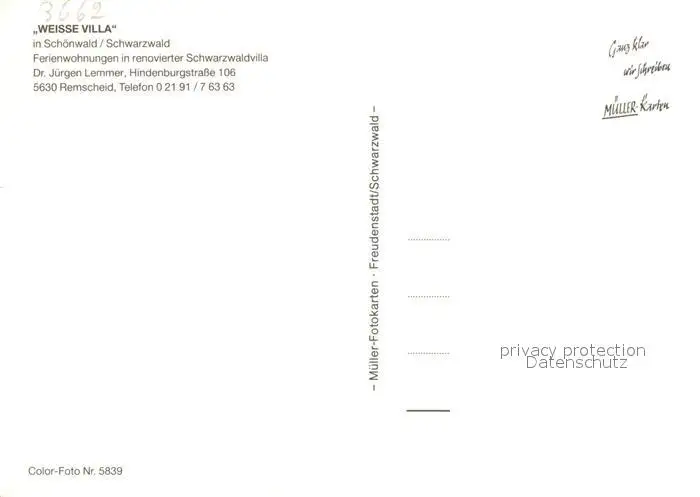 Schoenwald_Schwarzwald Schwarzwaldvilla Weisse Villa Ferienwohnungen Schoenwald Schwarzwald postalisch nicht gelaufen nach 1965 Erhaltung siehe scans [FriedD77] Frierer