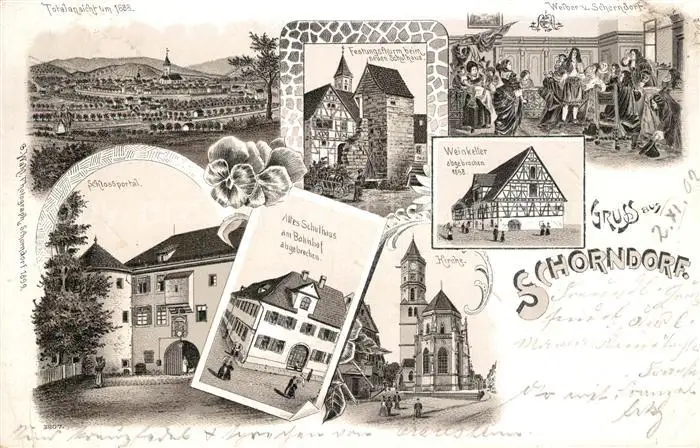 Schorndorf Wuerttemberg Kategorie Alte Ansichtskarten Postkarten bx44579 Schorndorf_Wuerttemberg Weinkeller Kirche Schulhaus Festungsturm Litho Schorndorf Wuerttemberg postalisch gelaufen 1902 Erhaltung siehe scans [PaolaD17]