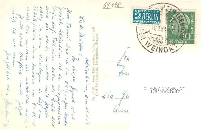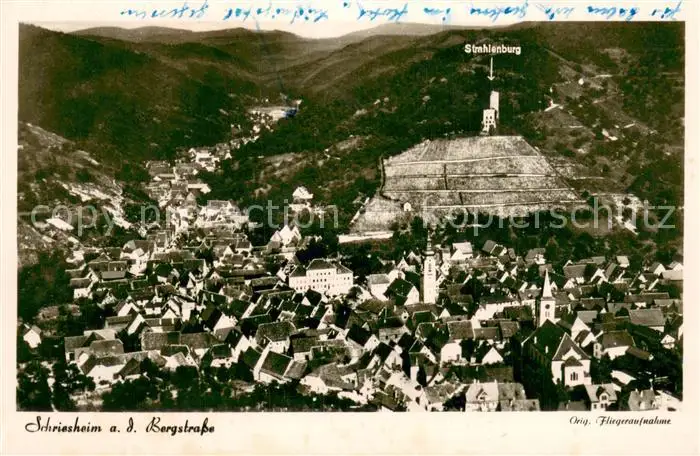 Schriesheim Fliegeraufnahme Gesamtansicht m. Strahlenburg Schriesheim postalisch gelaufen 1954 Erhaltung siehe scans [LiesaD40] LiesID40