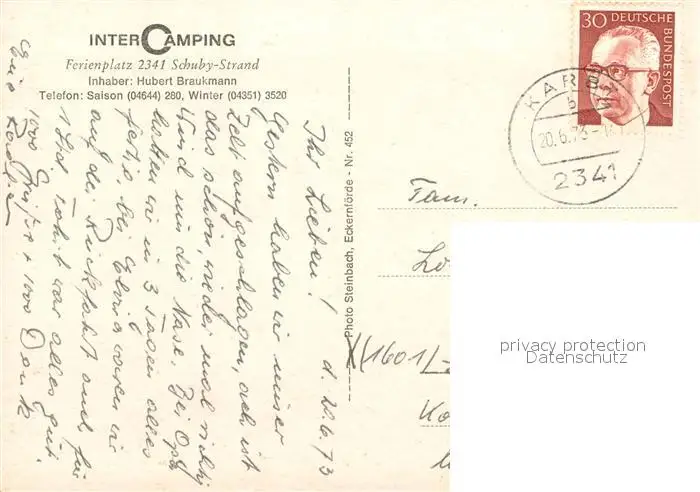 Schuby Campingplatz am Strand Einkaufsladen Gaststaette Schuby postalisch gelaufen 1973 Erhaltung siehe scans [FriedD77] Frierer