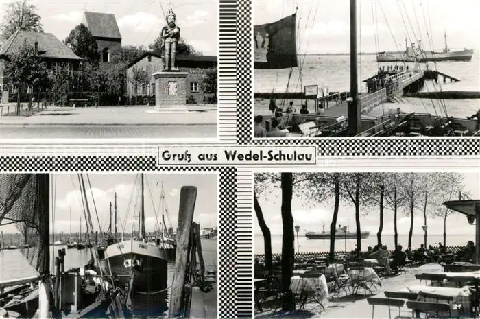 AK / Ansichtskarte Schulau_Wedel Willkomm Hoeft Faehrhaus Restaurant Terrasse Hafen Fischkutter Denkmal Schulau_Wedel