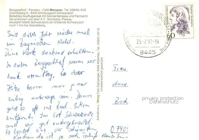 Schwarzach_Straubing-Bogen Berggasthof Pension Cafe Menauer Gastraeume Hinweisschild Schwarzach postalisch gelaufen 1992 Erhaltung siehe scans [WerneD78] WernPID7