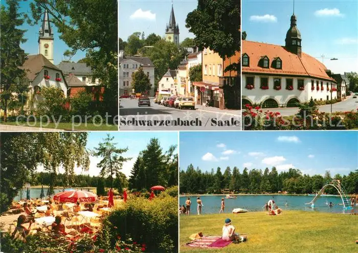 AK / Ansichtskarte Schwarzenbach_Saale Ortsmotiv mit Kirche Restaurant Terrasse Badesee Schwarzenbach_Saale