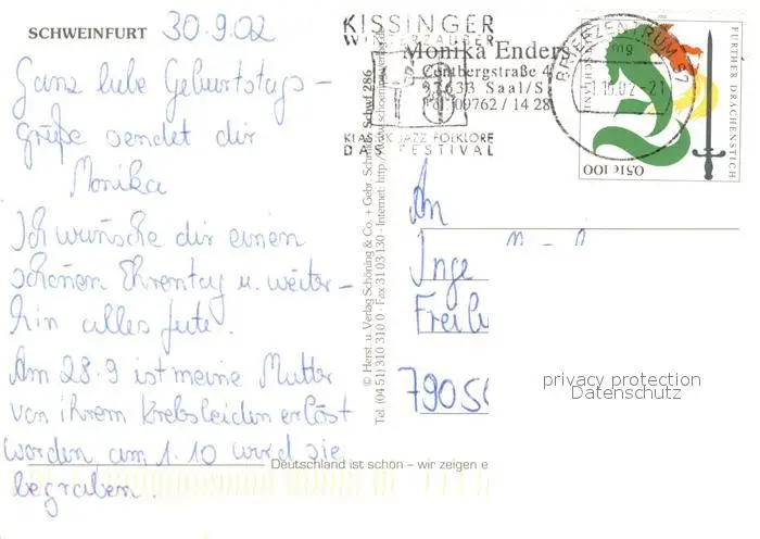 Schweinfurt Kirche Marktplatz Rueckert Denkmal Haeuserpartie Innenstadt Skulptur Schweinfurt postalisch gelaufen 2002 Erhaltung siehe scans [FriedD77] Frierer